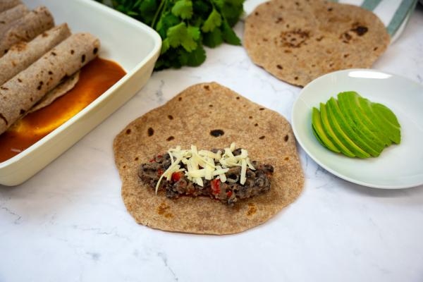 - To assemble the enchiladas, evenly divide bean filling onto each tortilla and top with 15 mL (1 tbsp) mozzarella cheese.