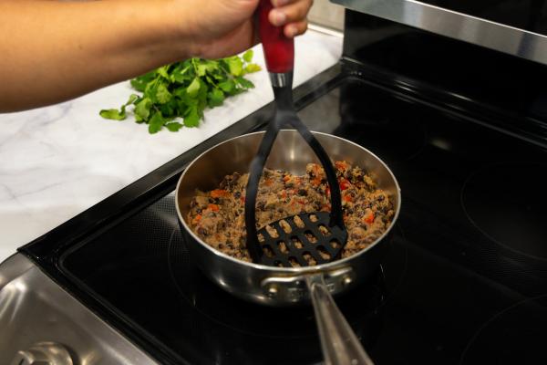 - Remove from heat and using a potato masher, gently mash beans. Set aside.