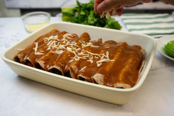 - Roll enchiladas and place in the prepared baking dish with sauce.