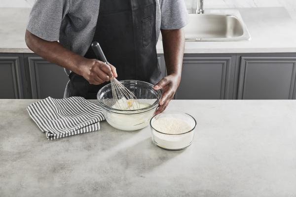 In a large bowl, whisk sour cream, milk, oil, and eggs together.
